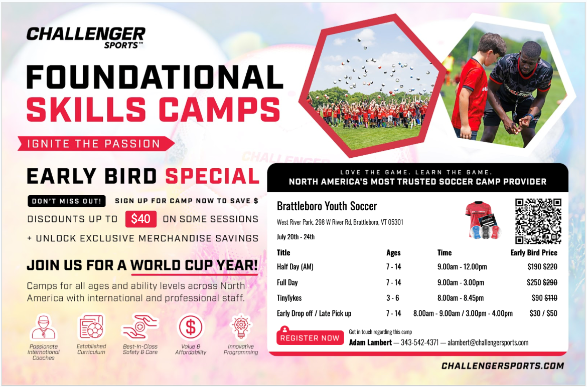 Join Brattleboro Storm and Challenger Sports for a fun, high-energy summer soccer camp designed for players of all levels.