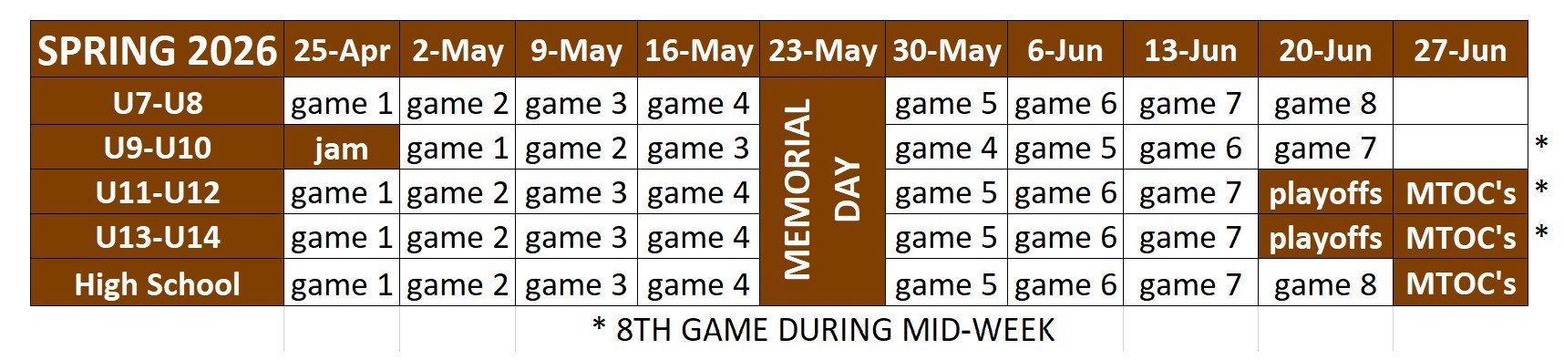 Games are on Saturdays with one (1) weekday game for some teams